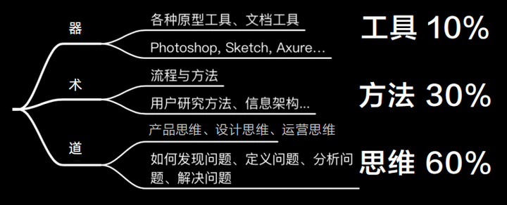 具体到产品经理这个岗位,器、术、道的占比大致分别为:工具10%,方法30%,思维60%。