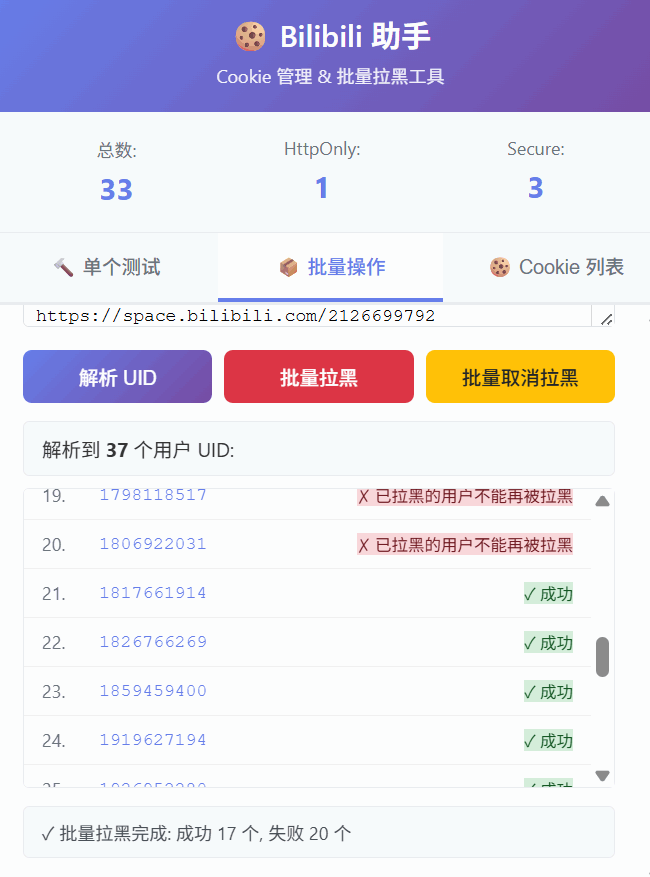 ⏳ 批量拉黑进度: 5/37 (成功 4, 失败 1) - 列表中每个 UID 旁边显示 ✓ 成功 或 ✗ 失败