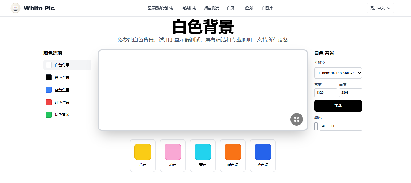 White Pic 是一个纯色背景图在线工具,可以根据不同设备和需求,选择适合的纯色背景,支持自定义分辨率和颜色选项。应用场景多种多样,无论是进行显示器测试、清洁屏幕还是作为摄影的光源,白色背景工具都能满足大家的需求,在手机、平板电脑等各类设备上均可完美显示。
