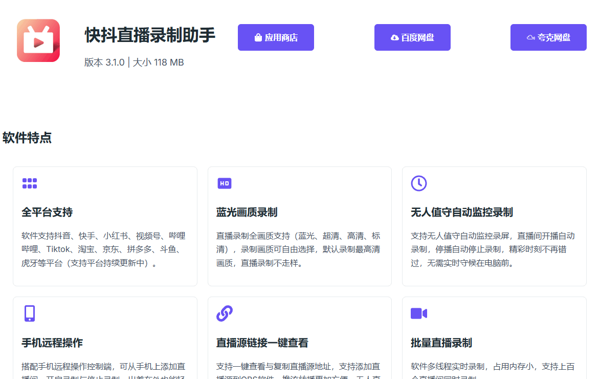 快抖直播录制助手是一款专业的直播录制软件,支持抖音、快手、小红书、视频号、bilibili、tiktok、淘宝、微博、斗鱼、虎牙、拼多多、京东直播监控录制。解决用户‘如何录制直播’、‘直播回放下载’等需求。软件支持无人值守自动监控录屏,原画高清录制,可一键获取直播源链接,直播人员必备软件。
