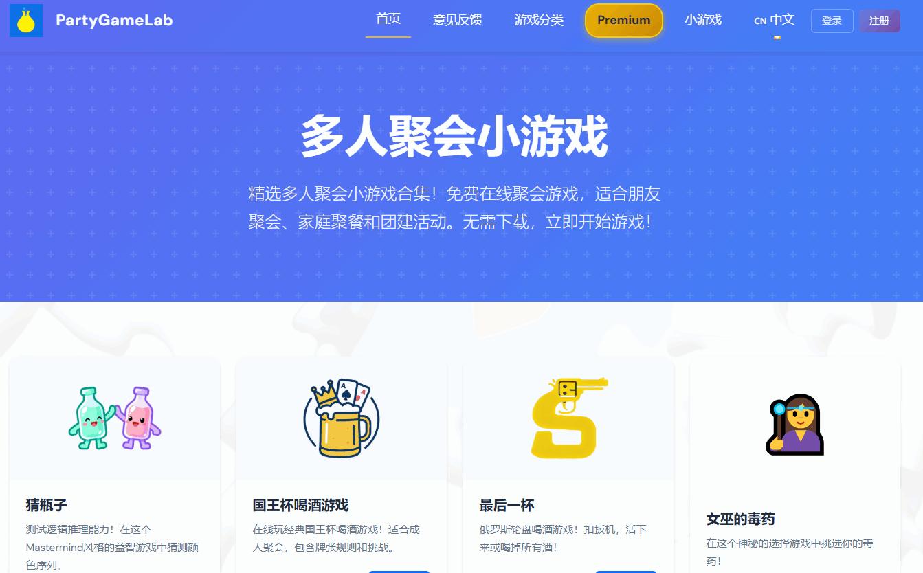 一个丰富的多人聚会小游戏合集,可以免费在线玩各种游戏,无需下载,直接在浏览器中开始。包括经典的“真心话大冒险”、“狼人杀”、“我有你没有”等,适合不同规模的聚会和各种场合。